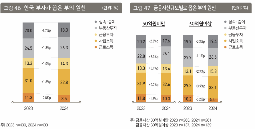 30억 이상 자산가 중 근로소득을 부의 원천으로 꼽은 비율이 '23년 대비 반토막, 5%에 불과