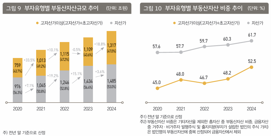 - '23년 대비 10.2% 증가, 법인명의 부동산 자산 급증(+26.4%) → 저자들은 법인들의 저점 매수를 원인으로 보고 있음