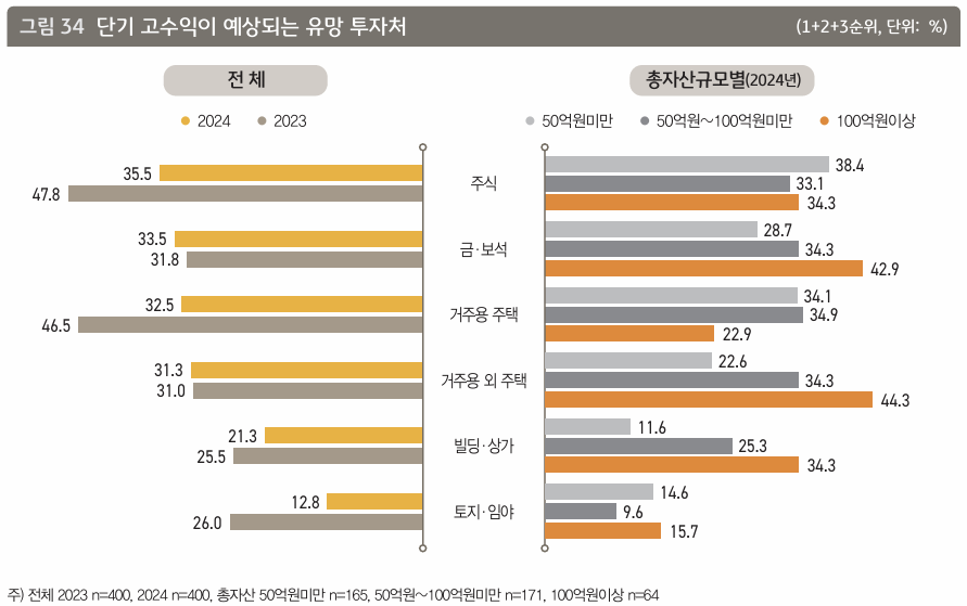 다만 100억 이상 고자산가들이 거주용 외 부동산과 금/보석을 유망하게 보고 있음