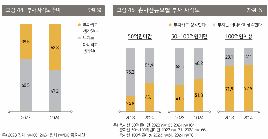 50~100억 자산가까지도 스스로 부자라고 생각하지 않는 경우가 과반이상, 이런 건 중산층이랑 비슷하네