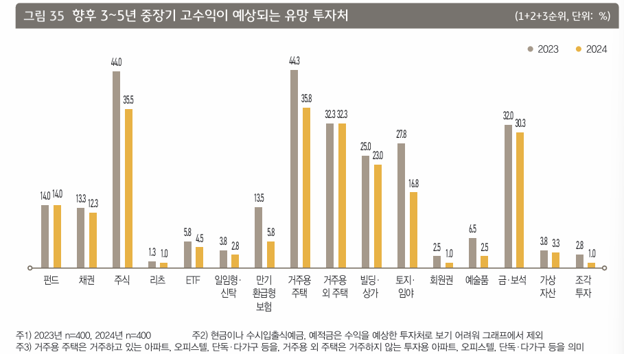 3~5년 중장기 투자에는 주식과 거주용 주택, 금/보석을 유망하다고 생각