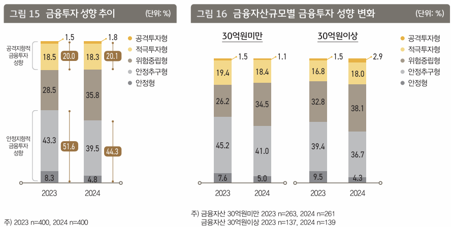 안정지향적 성향이 약해지고, 30억 이상 부자들이 작년보다 공격적, 적극적, 위험중립형이 늘어, 조금 더 Risk Taking 성향